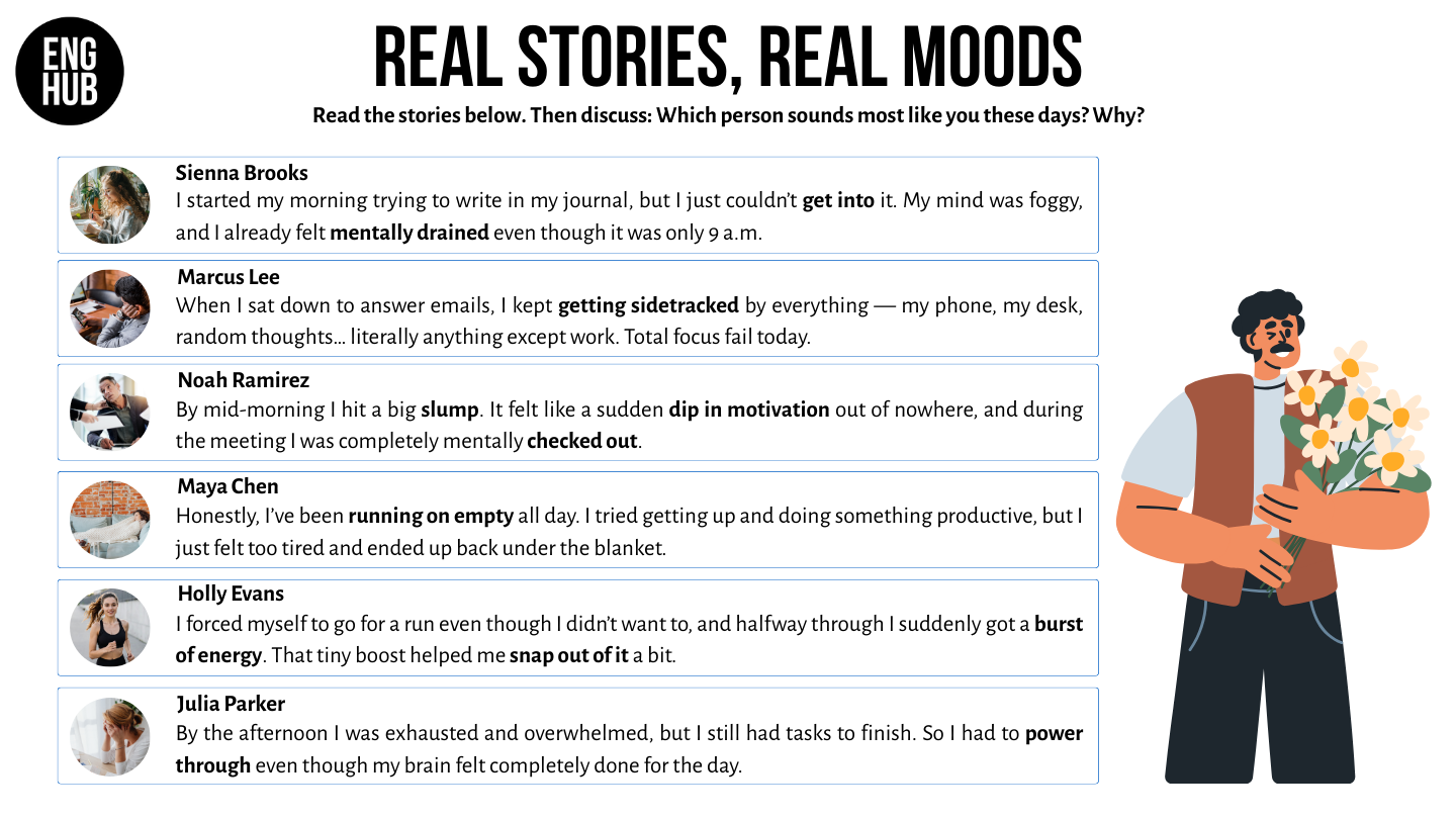 - Discuss other people’s moods while learning and using new vocabulary.