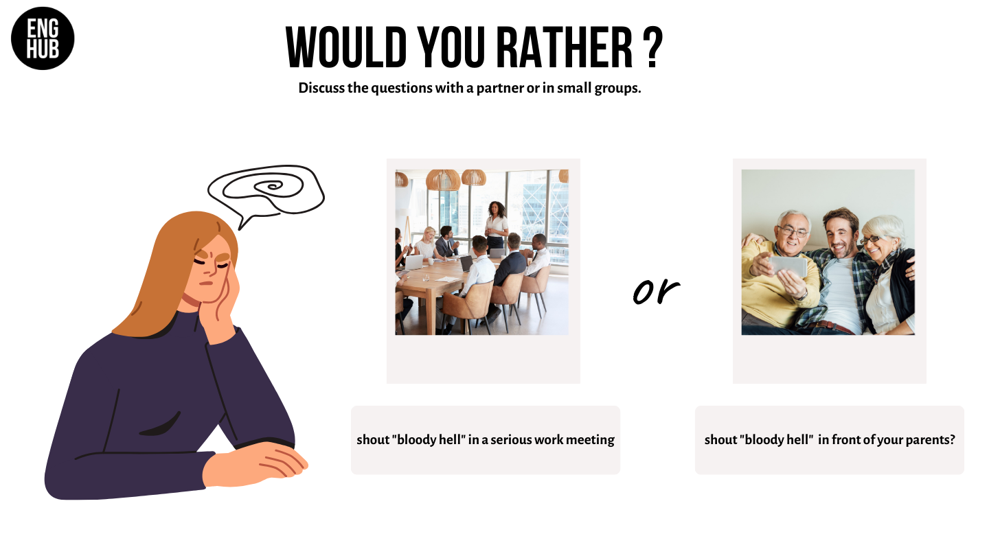 - Discuss “Would you rather...?” questions.