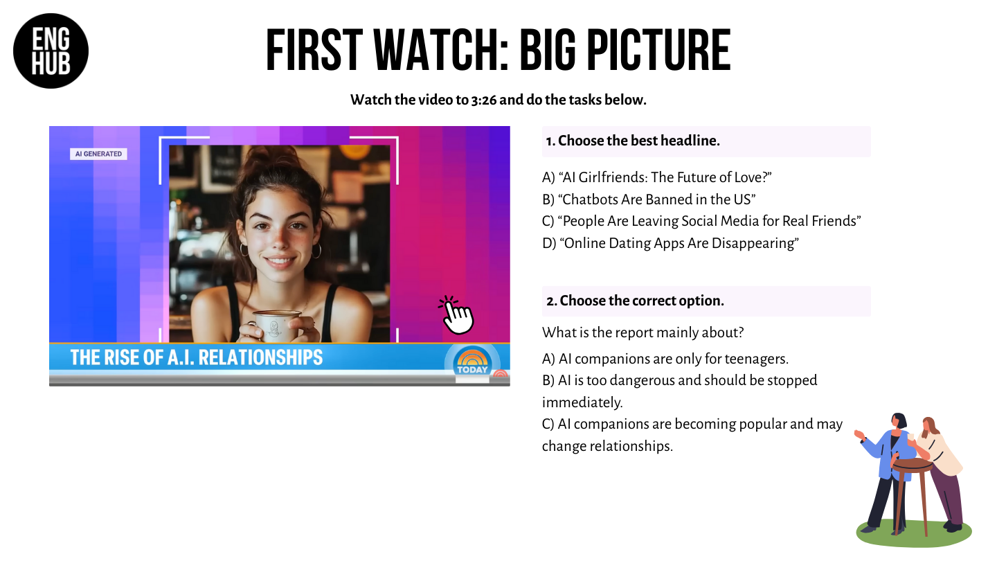 - Watch the video and complete listening for gist tasks (choose the best headline and summary).