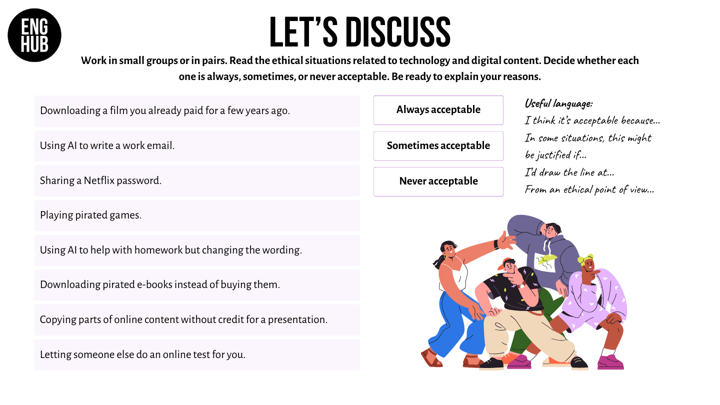 - Discuss ethical situations by encouraging learners to share their own experiences.
