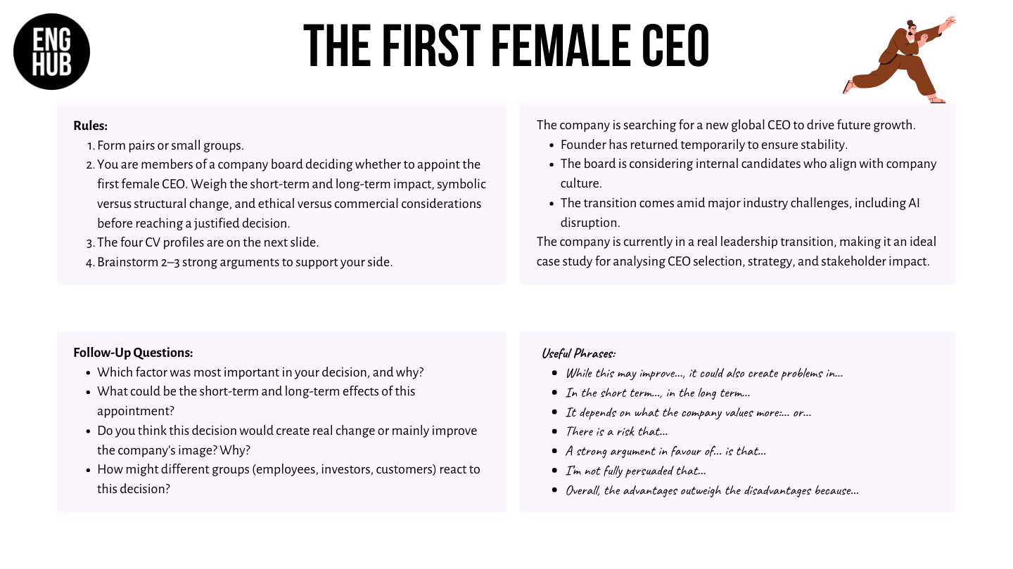 - Debate arguments about appointing a female CEO and consider short- and long-term impacts.