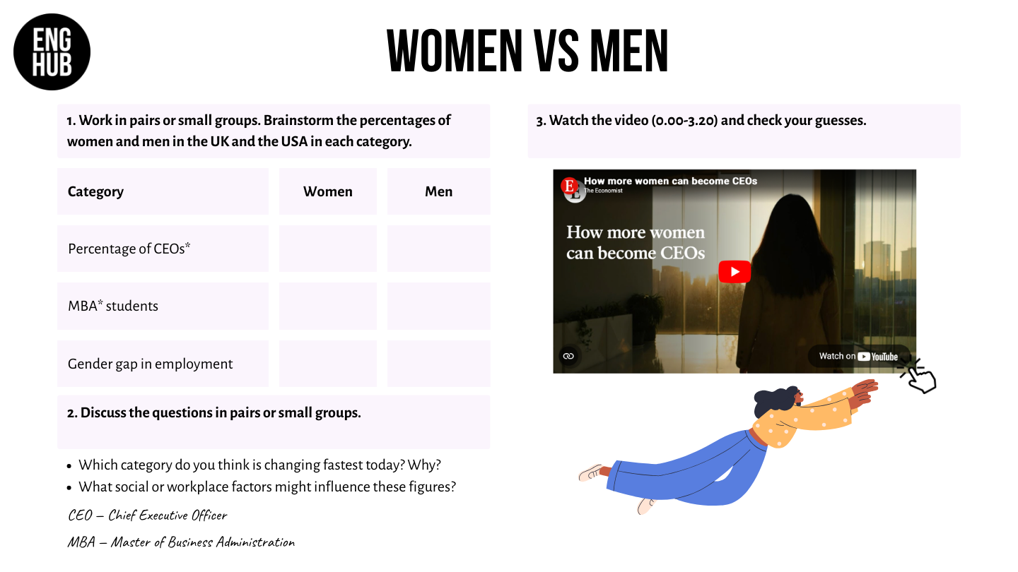 - Analyse news headlines about gender equality and leadership trends.
