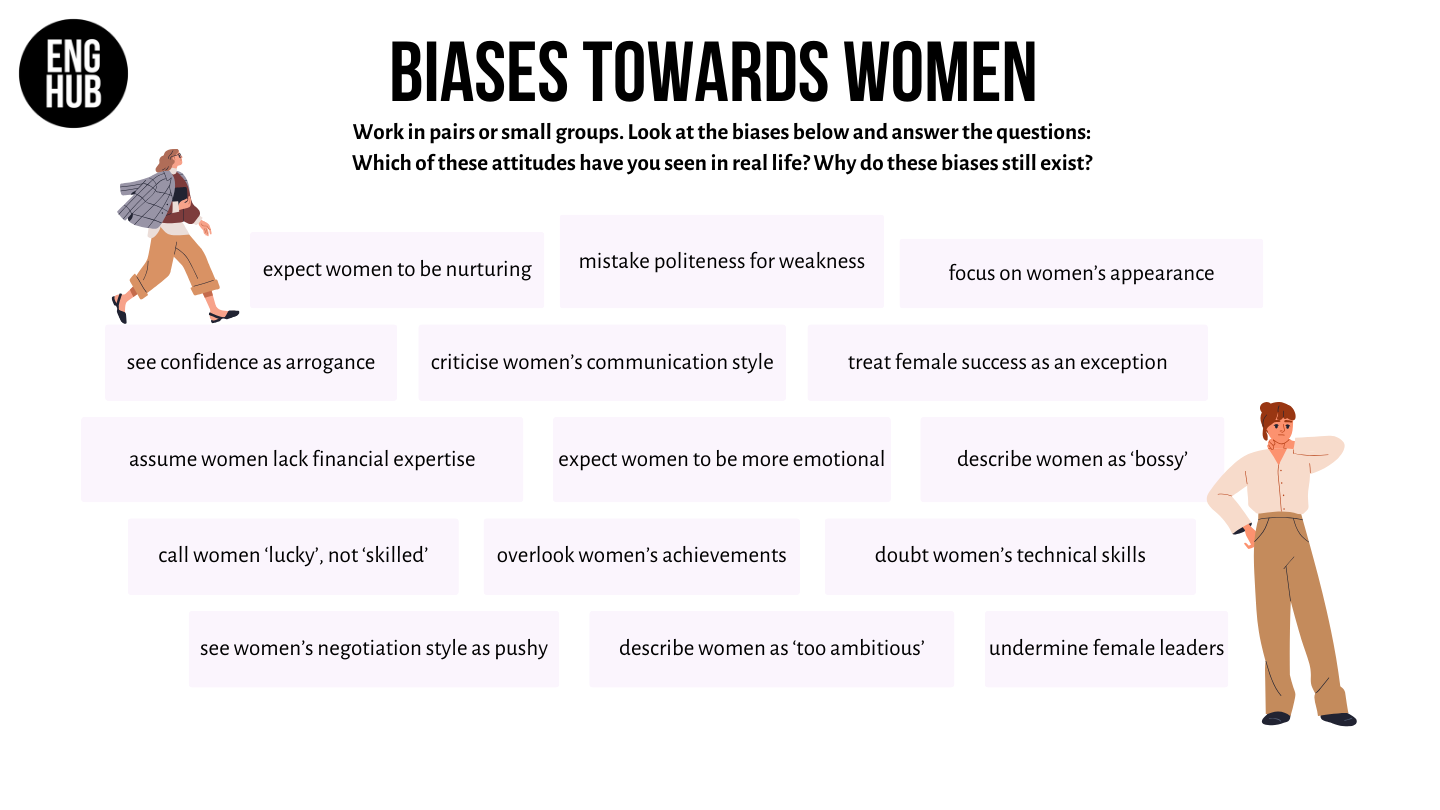 - Learn and practise key terms such as glass ceiling, glass cliff, bias, and gender parity.