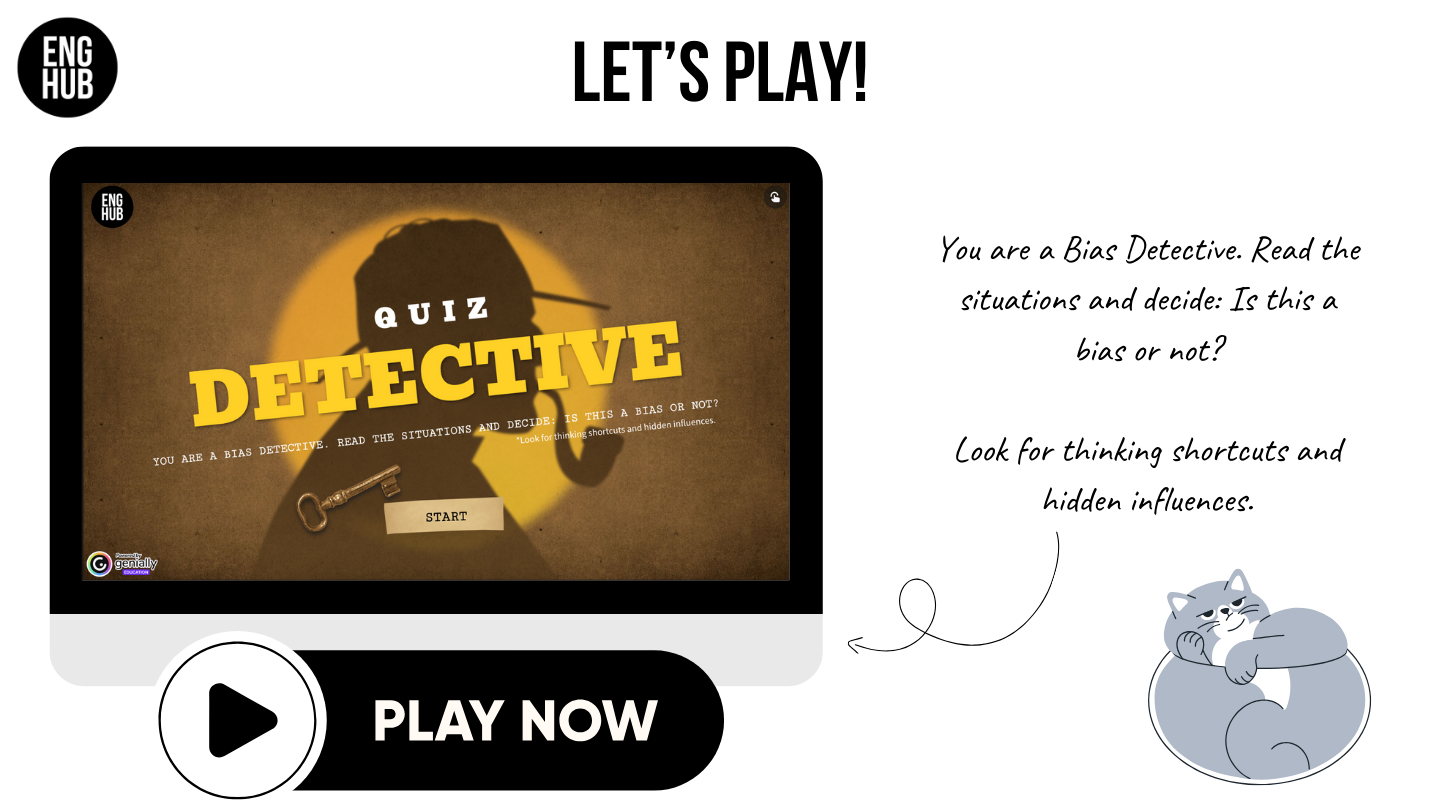 - Play an interactive Genially detective-style game to identify different biases.